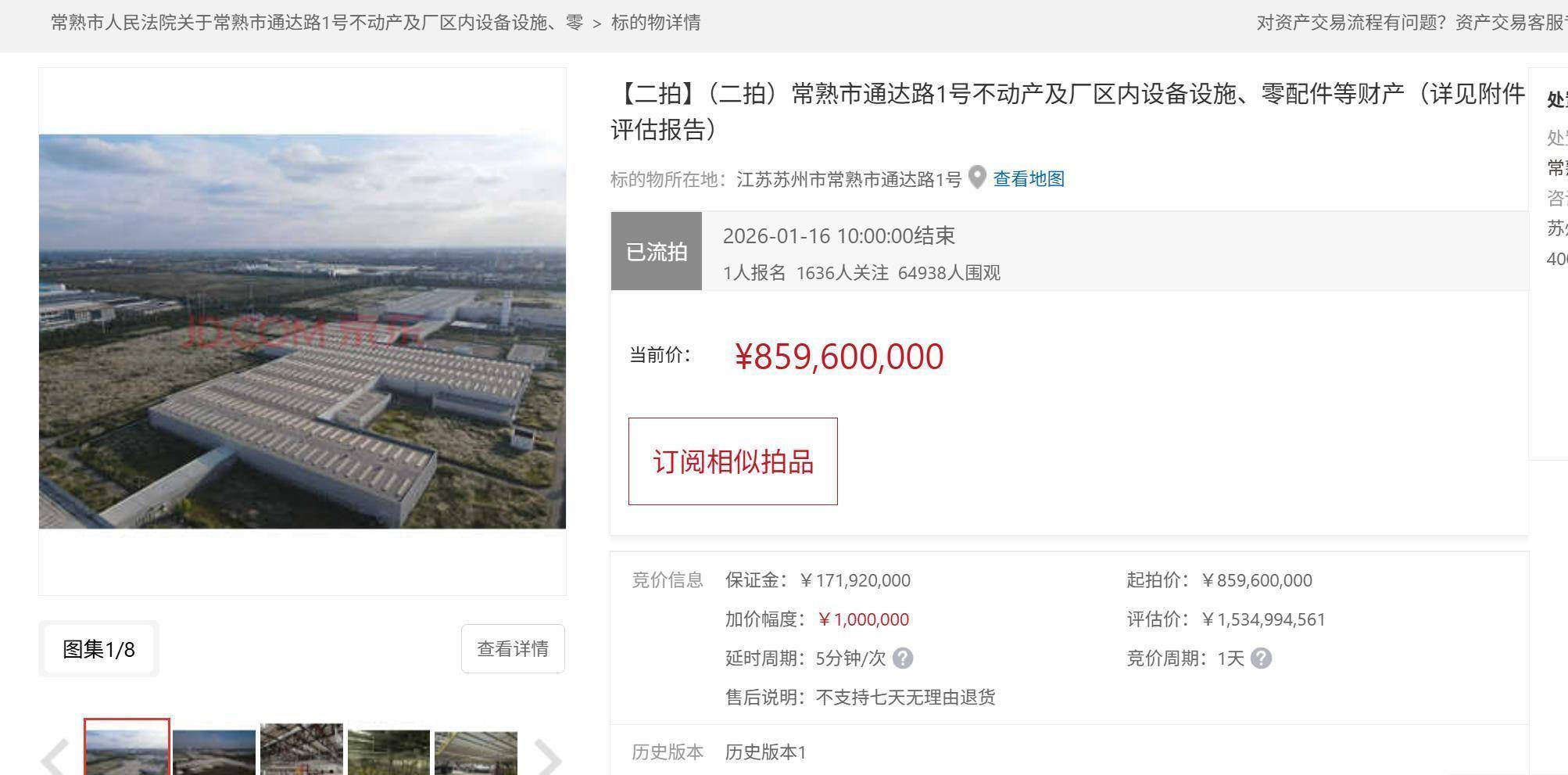 拍卖公告显露,不漂后汽车常熟工场第二次拍卖定于1月15日进行,财富评估价约15.35亿元,起拍价约8.59亿元,报名东说念主数为1东说念主。上述拍卖方向物地皮用途为工业用地,现在已被查封且有典质,开采总面积中的证载面积为183148.04闲居米,地皮总面积为716473闲居米,房产建成年份为2014年。第一次拍卖于2025年12月底进行,其时起拍价约10.75亿元,但最终流拍。